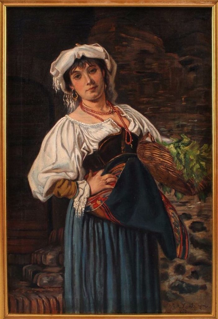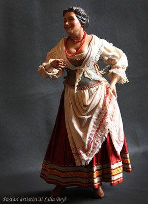 L’abito, infine, viene completato dagli accessori: sì quindi a scialli per proteggersi quando cala il sole, foulard, rosari o collane al collo per le più agiate, stracci appesi al grembiule o alla cintura, scarselle, cestini in vimini o borsette, cuffiette o fazzoletti in tessuto per proteggere il capo.